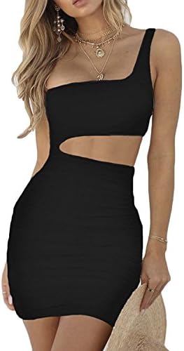 CHYRII Women's Sexy One Shoulder Sleeveless Cutout Ruched Bodycon Mini Club Dress