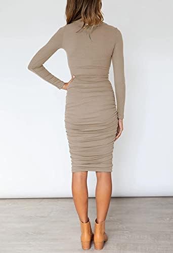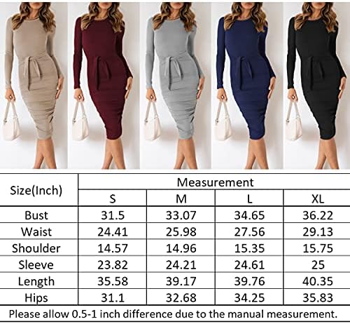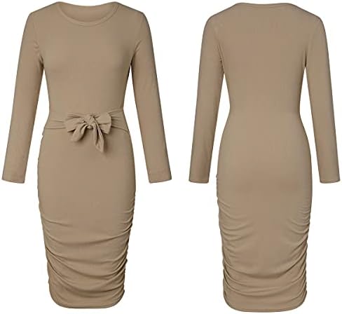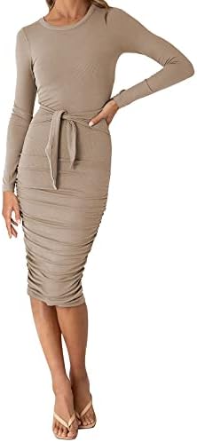 Long sleeve tie waist bodycon party dress, crew neck, solid color, the simple and basic dress design makes this midi dress suitable for most lady’s body shape