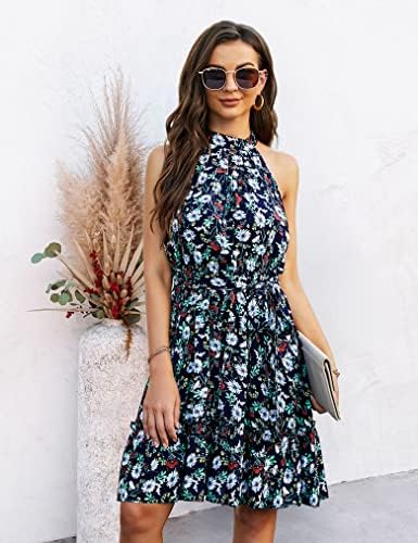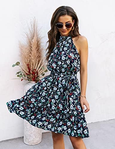 Features: halter dress for women, high neck,floral print,a line,sleeveless,elastic high waist with belt,pleated, backless, swing, above knee, ruffle hemline