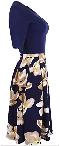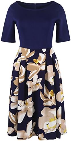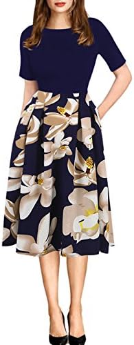 oxiuly Women's Vintage Patchwork Puffy Swing Casual Party Dress Elegant Work Dresses Party Cocktail Swing Midi Dresses with Pockets