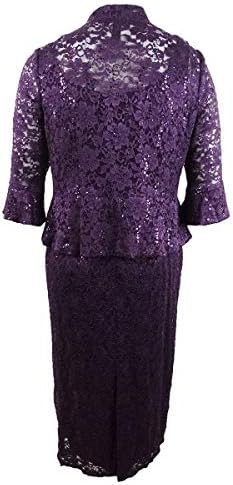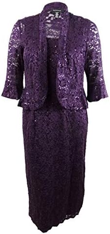 Two piece collarless open front ruffled hem lace jacket with allover sequined lace and a sheath dress that falls to an ultra flattering midi length